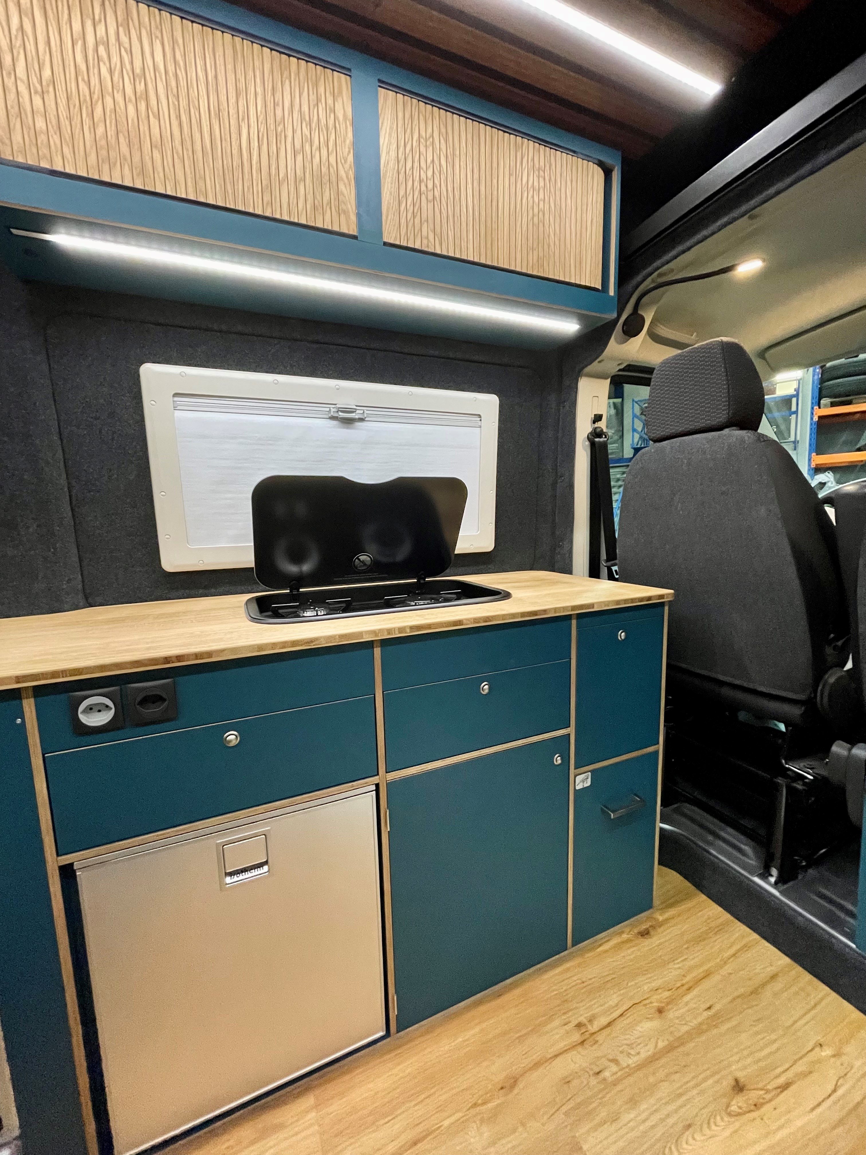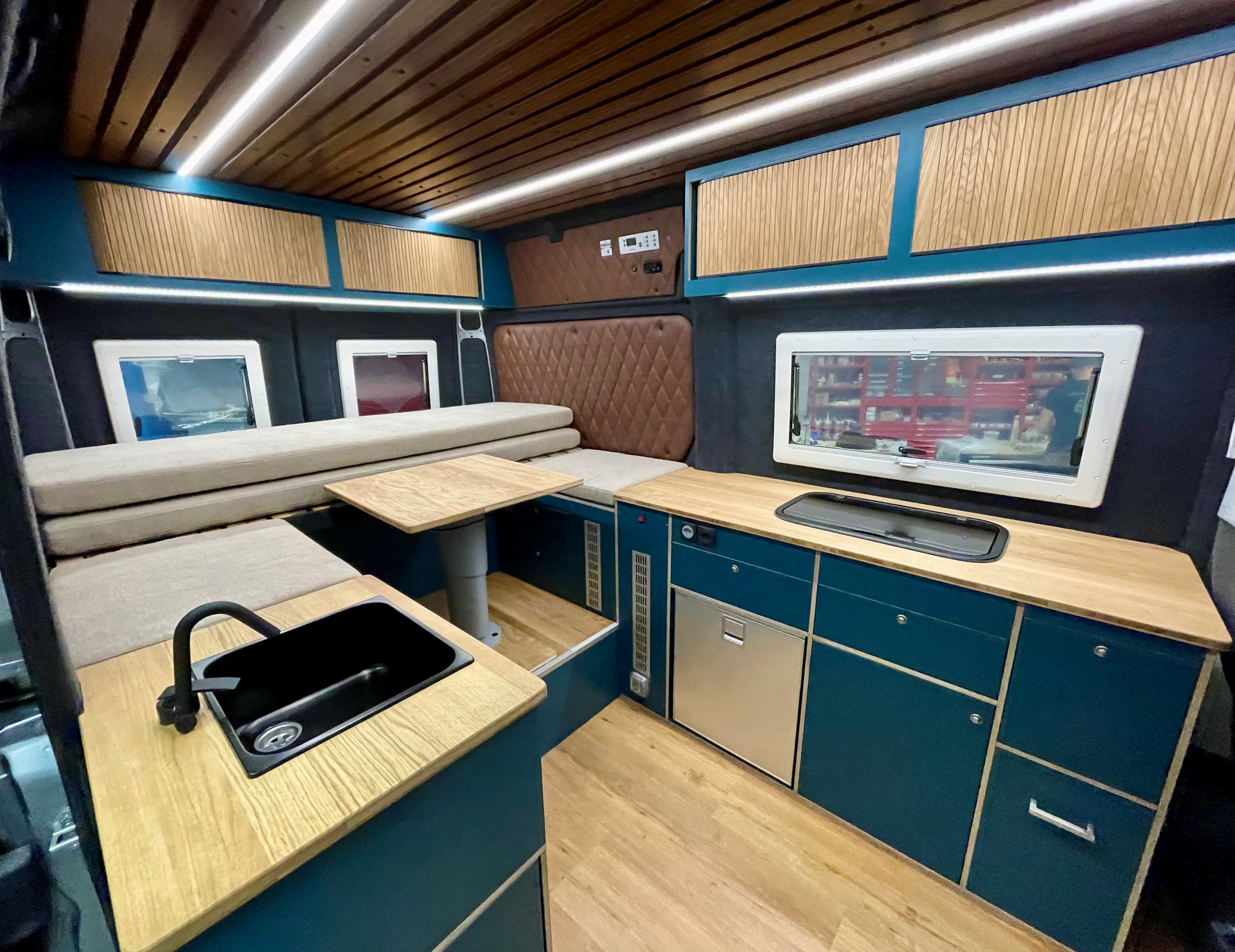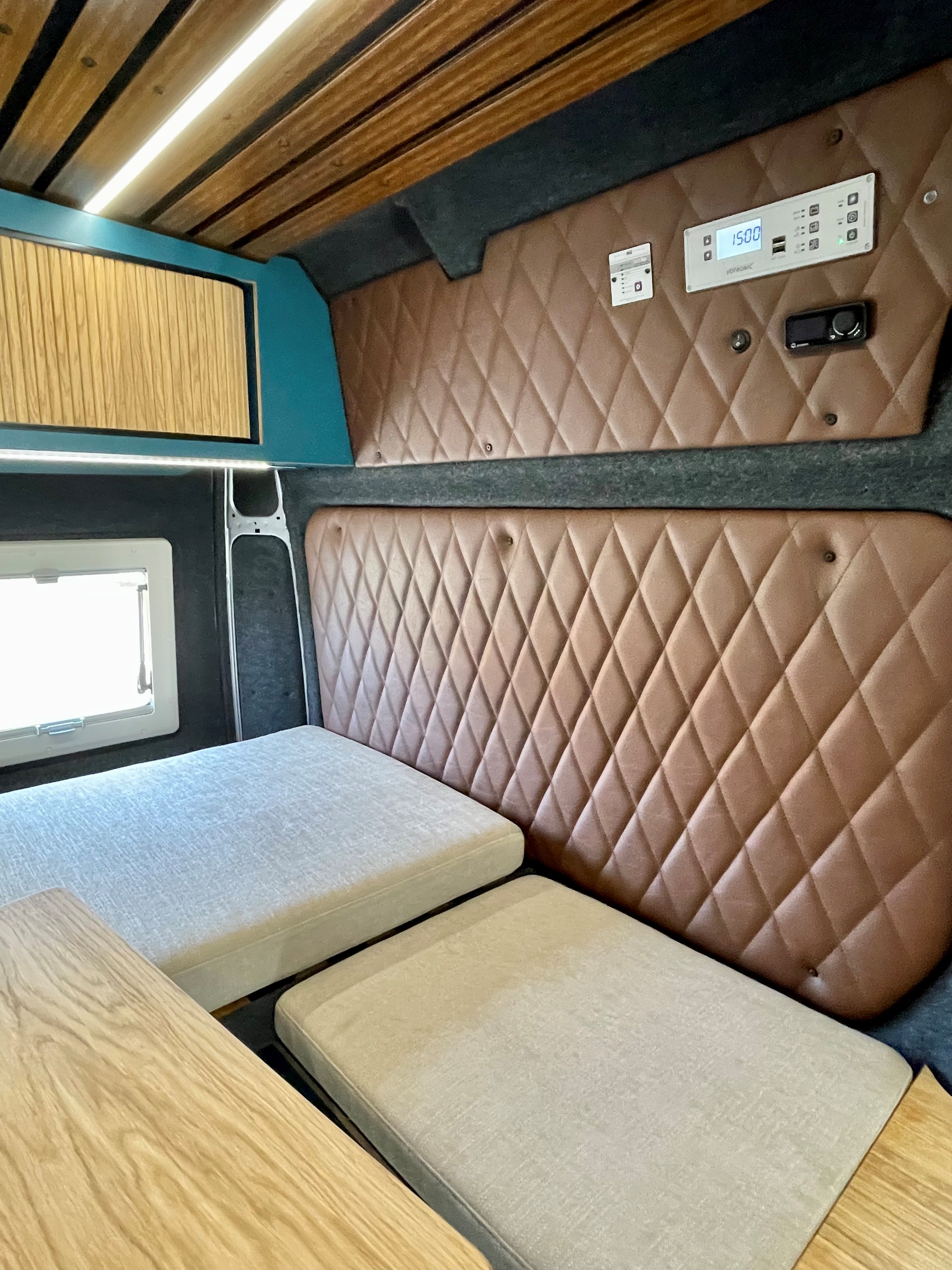 Für den Hauch Luxus und die feine Optik sorgt das Material und Farbkonzept. Eine Himmelverkleidung wie eine Luxusyacht mit engelassenen LED Schienen, alle Wände komplett Verkleidet mit Innenvelours oder perfekt gestickten Abdeckungen aus Kunstleder... das bedingt auch für den weiteren Ausbau ein hochwertiges Finish. So sind die Rolltüren aus Eiche, der Vinylboden ebenfalls in Eichenoptik und die Arbeitsplatten aus Eichenvollholz.