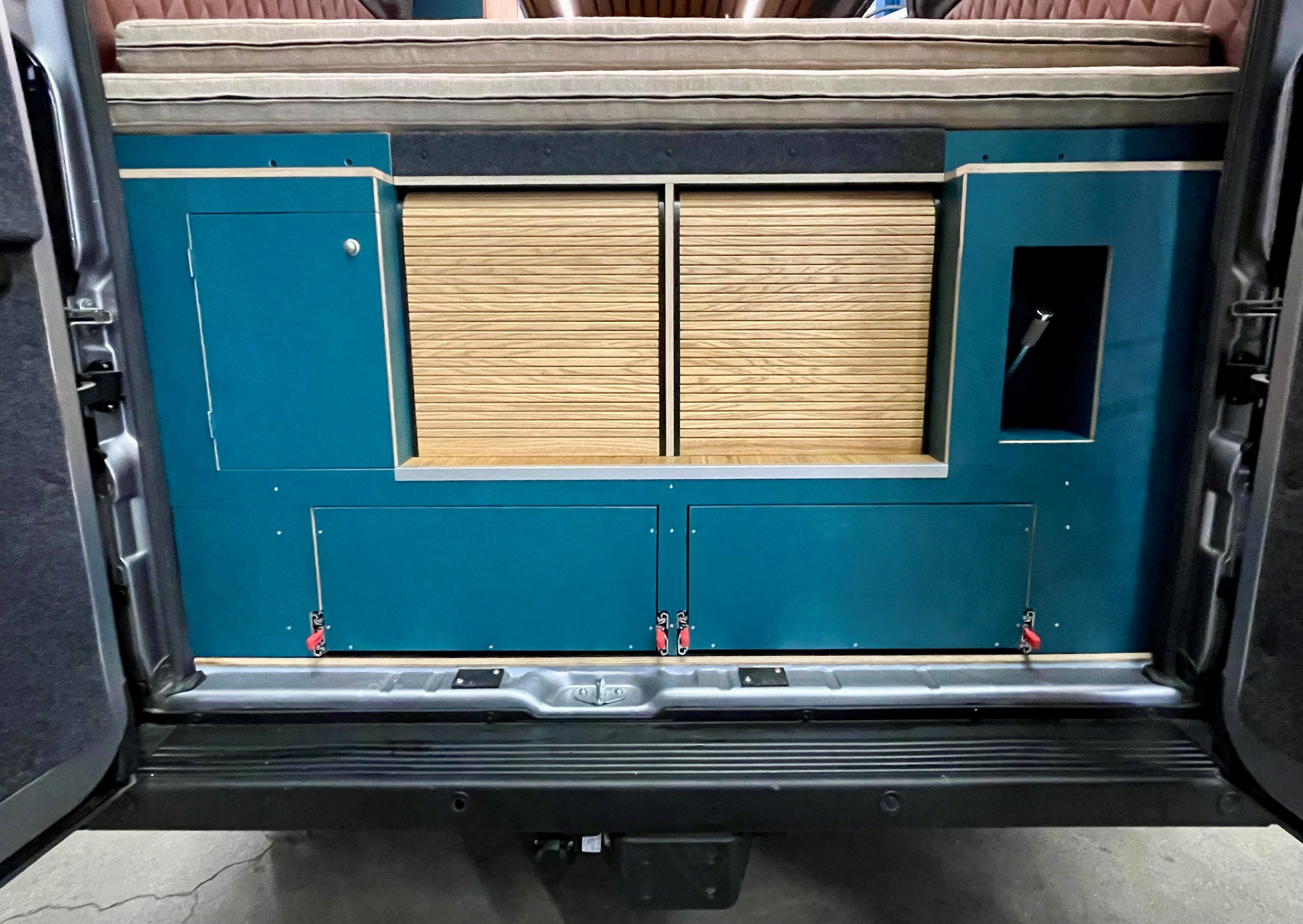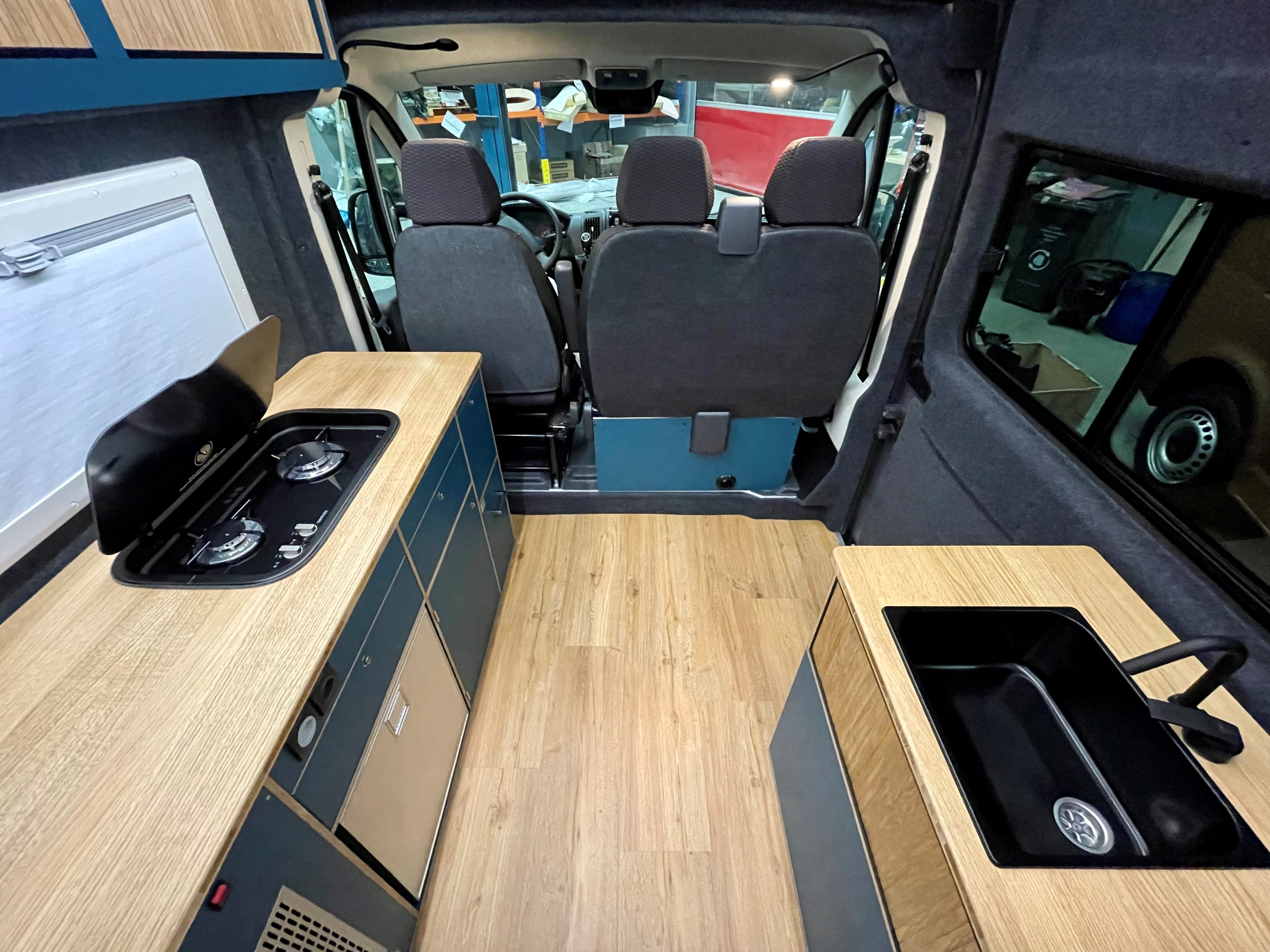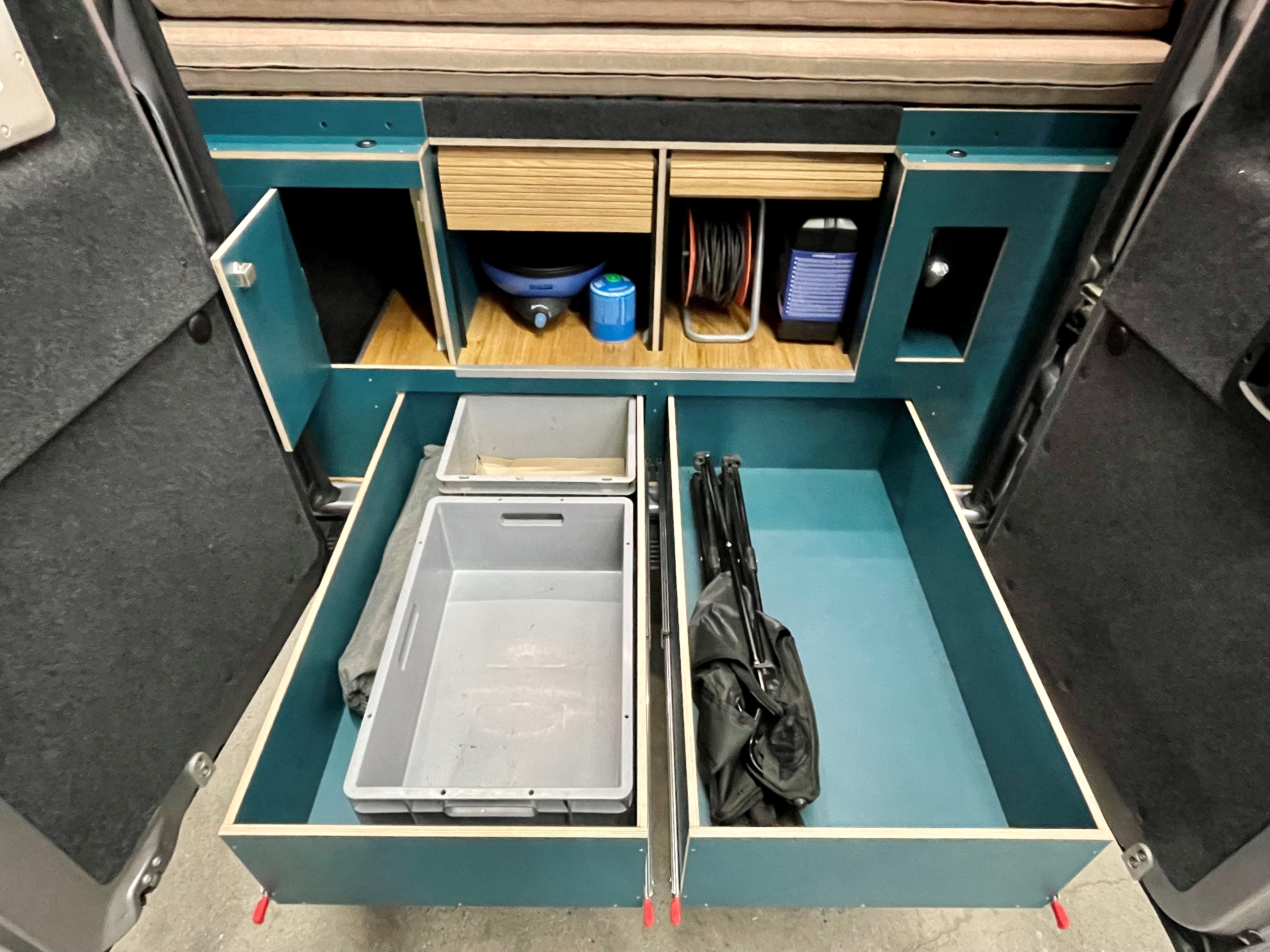 Für den Hauch Luxus und die feine Optik sorgt das Material und Farbkonzept. Eine Himmelverkleidung wie eine Luxusyacht mit engelassenen LED Schienen, alle Wände komplett Verkleidet mit Innenvelours oder perfekt gestickten Abdeckungen aus Kunstleder... das bedingt auch für den weiteren Ausbau ein hochwertiges Finish. So sind die Rolltüren aus Eiche, der Vinylboden ebenfalls in Eichenoptik und die Arbeitsplatten aus Eichenvollholz.