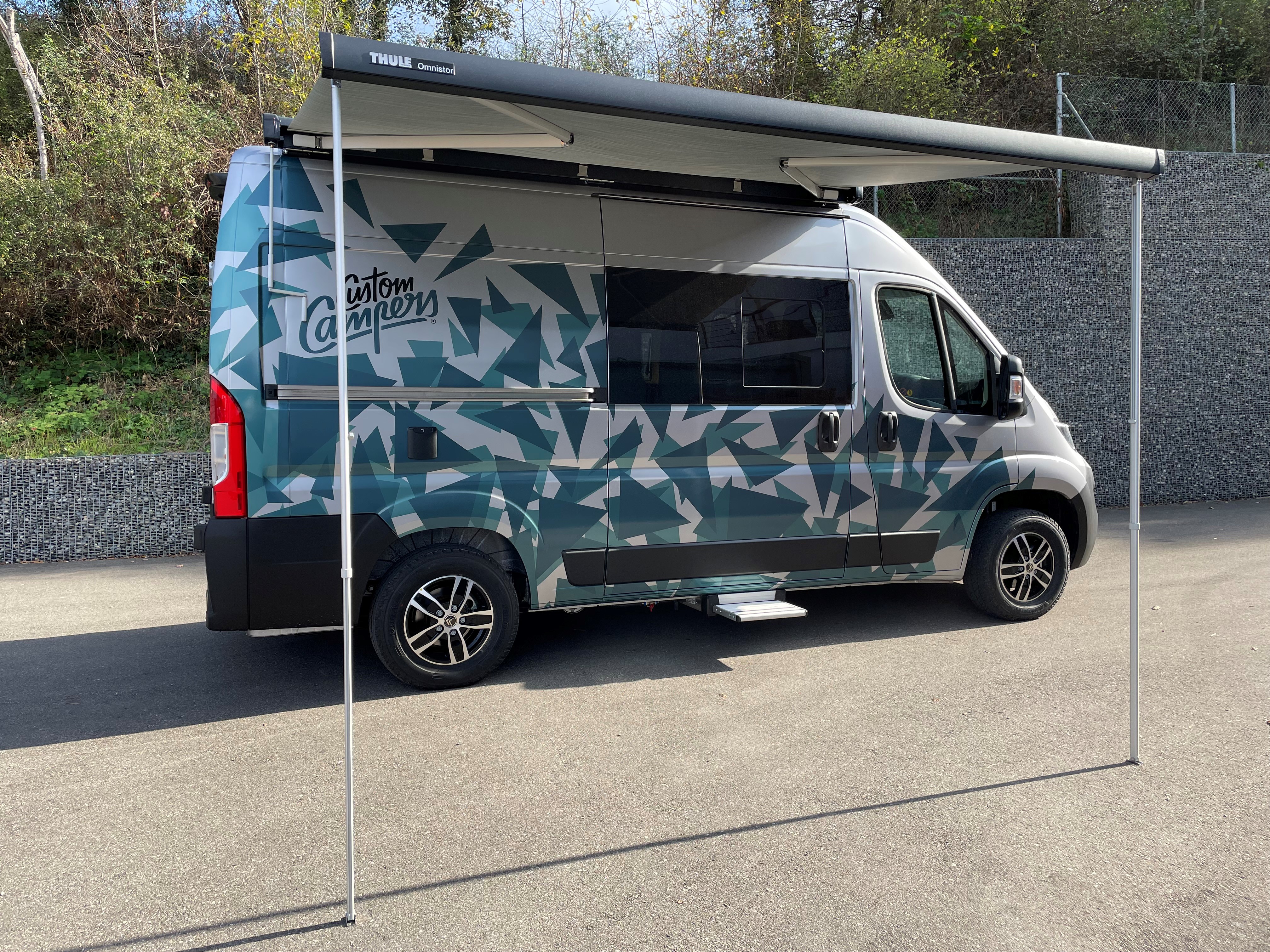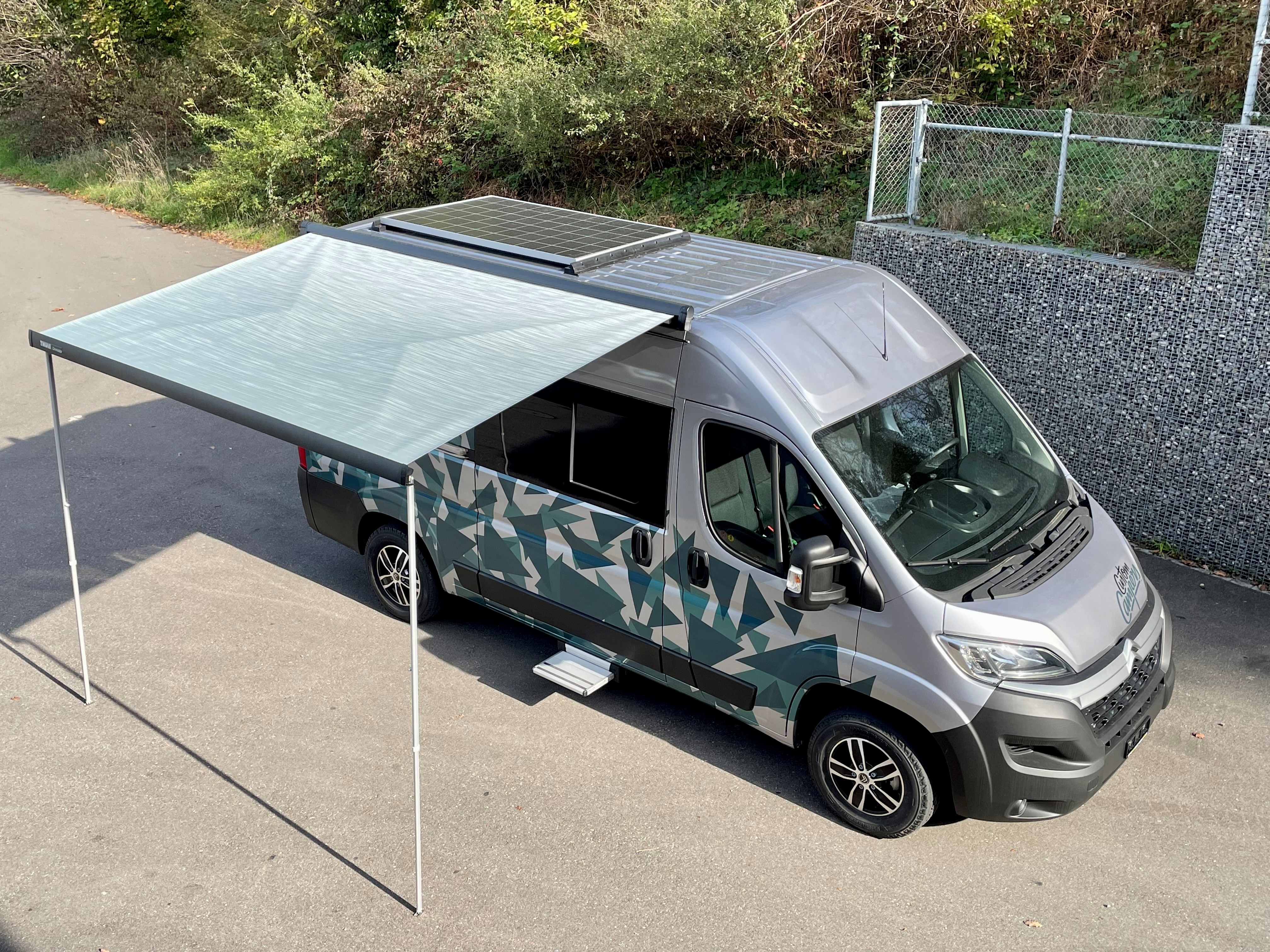 Das Fahrzeug hat zusätzlich eine aufwändig Folierung, eine Bear-Lock Wegfahrsperre, eine 3 Meter Markise und extra Felgen spendiert bekommen.
