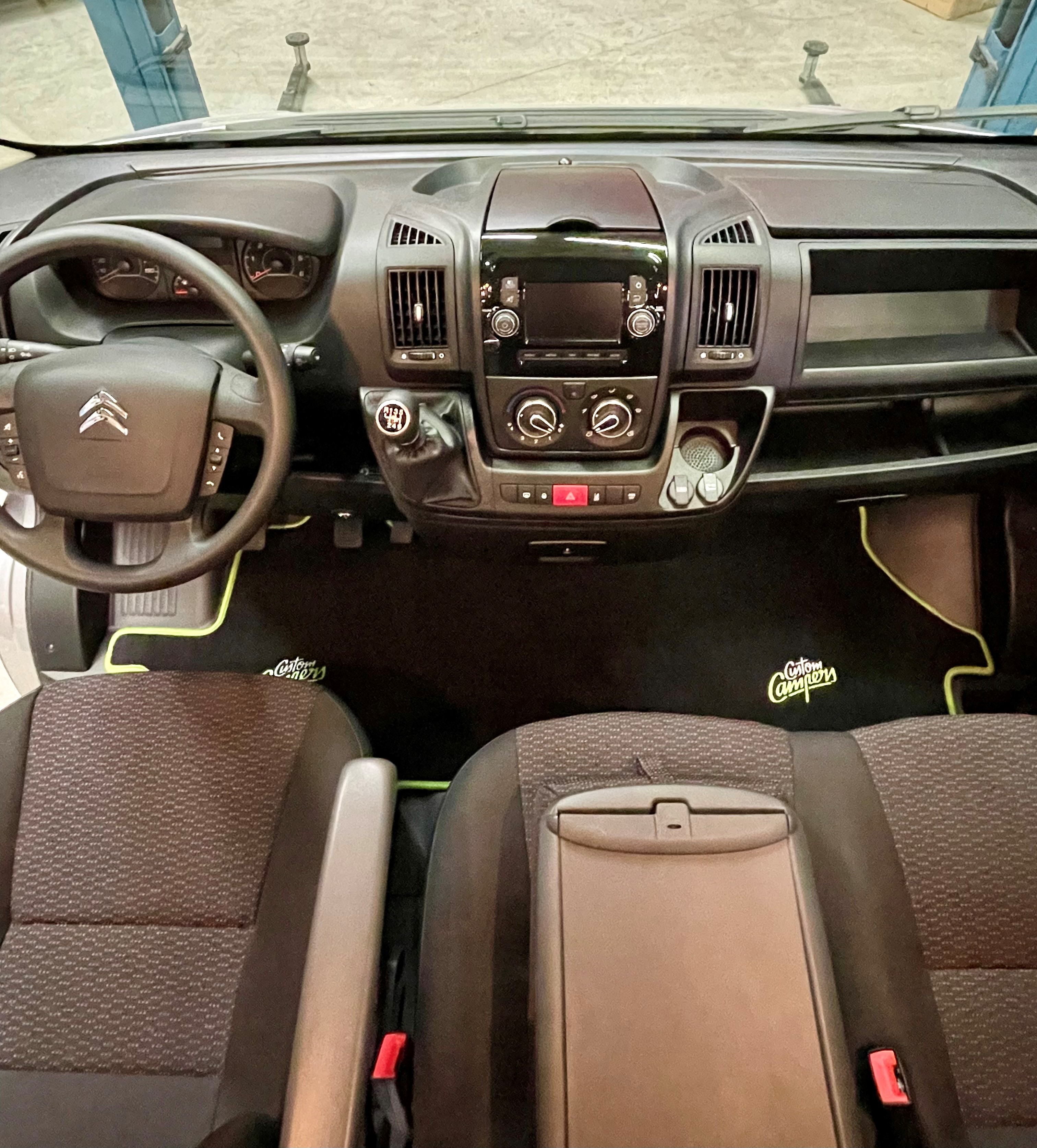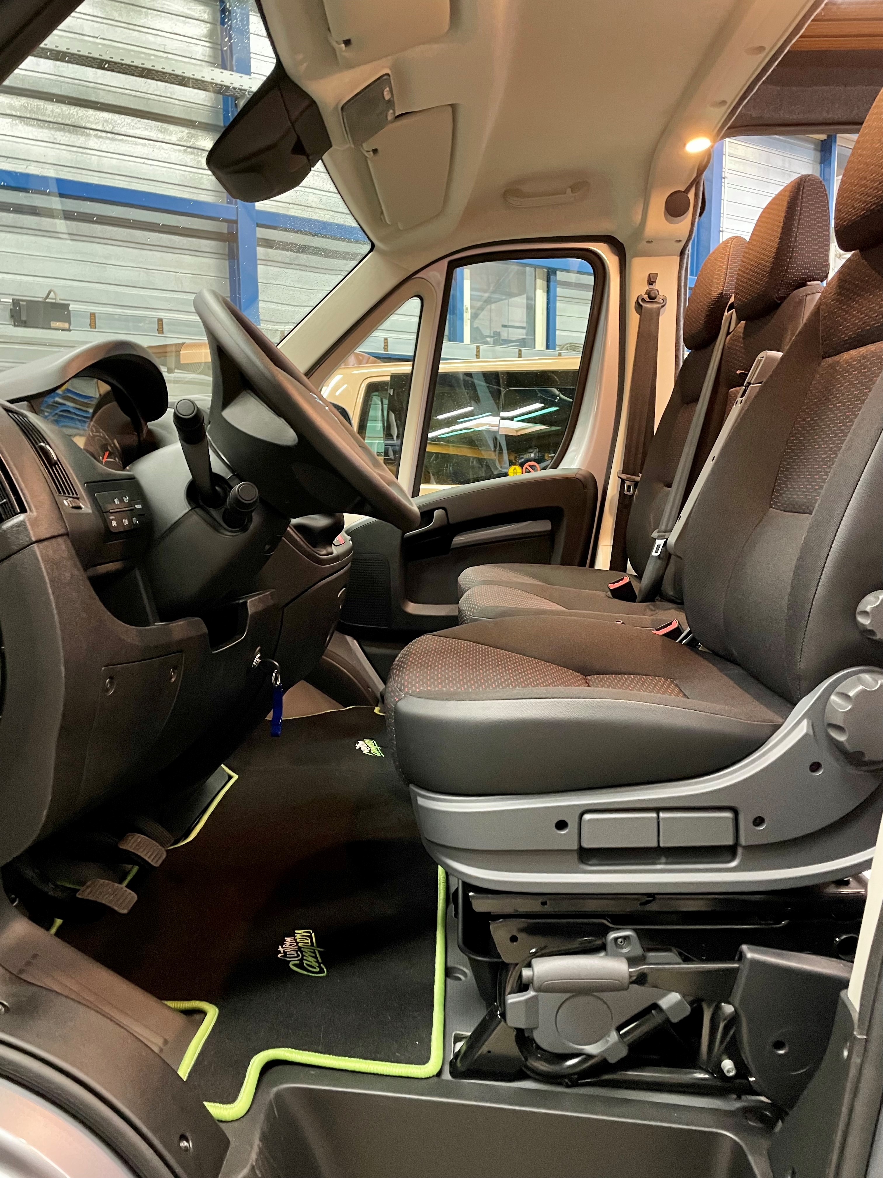 Als Basis dient ein Citroën Jumper L2H2. Eine gesamte Fahrzeuglänge von nur 5,4 Meter und doch ist es uns gelungen ein Raumwunder zu schaffen. Angefangen im Heck mit zwei Schwerlastauszügen von Einem Meter Länge, Rolltüren, weiterem Stauraum unter der Sitzbank und einer Aussendusche. Das Stauraum Angebot geht im Innenraum weiter mit der grössten Küchenzeile dieser Fahrzeugkategorie, dezenten Oberschränken und Schubladen in der Sitzbank. Selbst eine ausziehbare Toilette findet unter dem Waschbecken Platz. Der Stauraum über dem Cockpit darf ebenfalls nicht vernachlässigt werden. Alles was man braucht kann mit und findet seinen Platz. Sind die 112 Liter Frischwasser und die 80 Liter Diesel vollgetankt und der Fahrer auf seinem Platz bleiben immer noch fast 600 Kilo Zuladung.