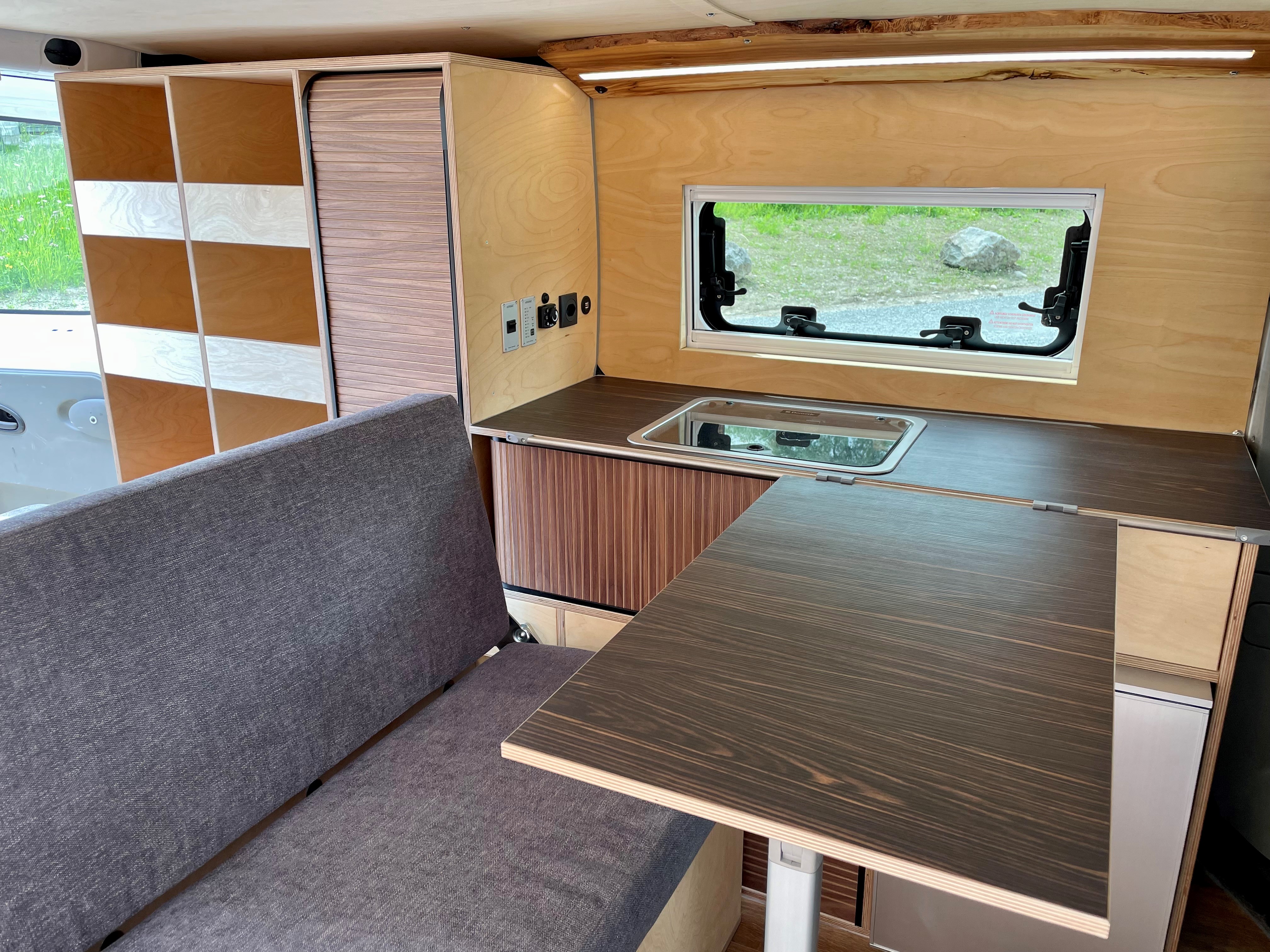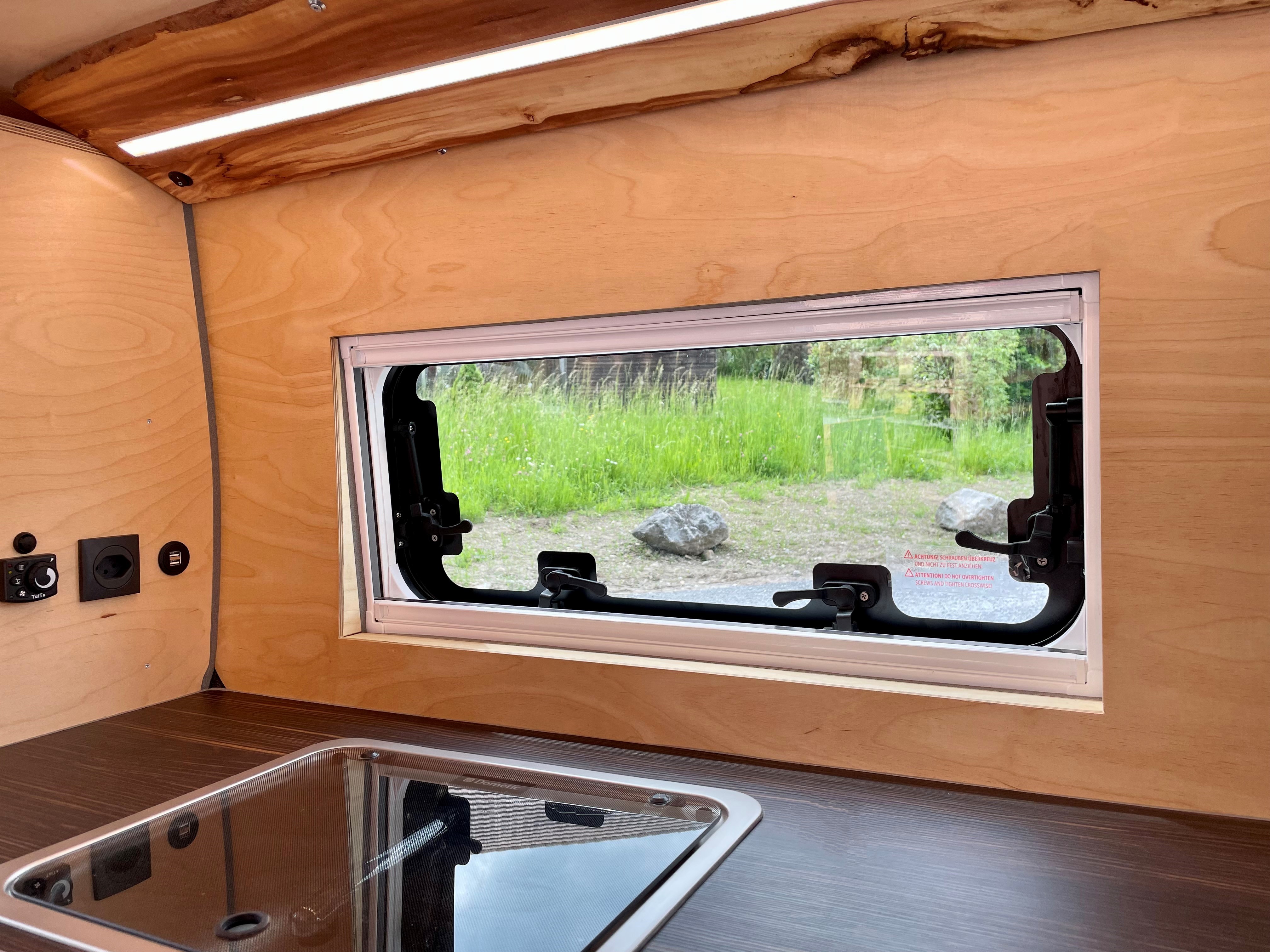 Das neu eingebaute Ausstellfenster mit Mückennetz und Rollo sorgt für ruhige Nächte mit einer angenehmen Brise. Was es sonst noch für einen erholsamen Schlaf und als gemütliche Sitzgelegenheit braucht, deckt die universelle Schlafsitzbank hervorragend ab. Bereits in der Sitzkiste gibt es massig Stauraum aber die vielen Staufächer, Schränke und die Besteckschublade runden das Platzangebot ab. Zum ersten mal kamen hochwertige und optisch perfekt harmonierende Rolltüren aus Wallnussholz zum Einsatz.
