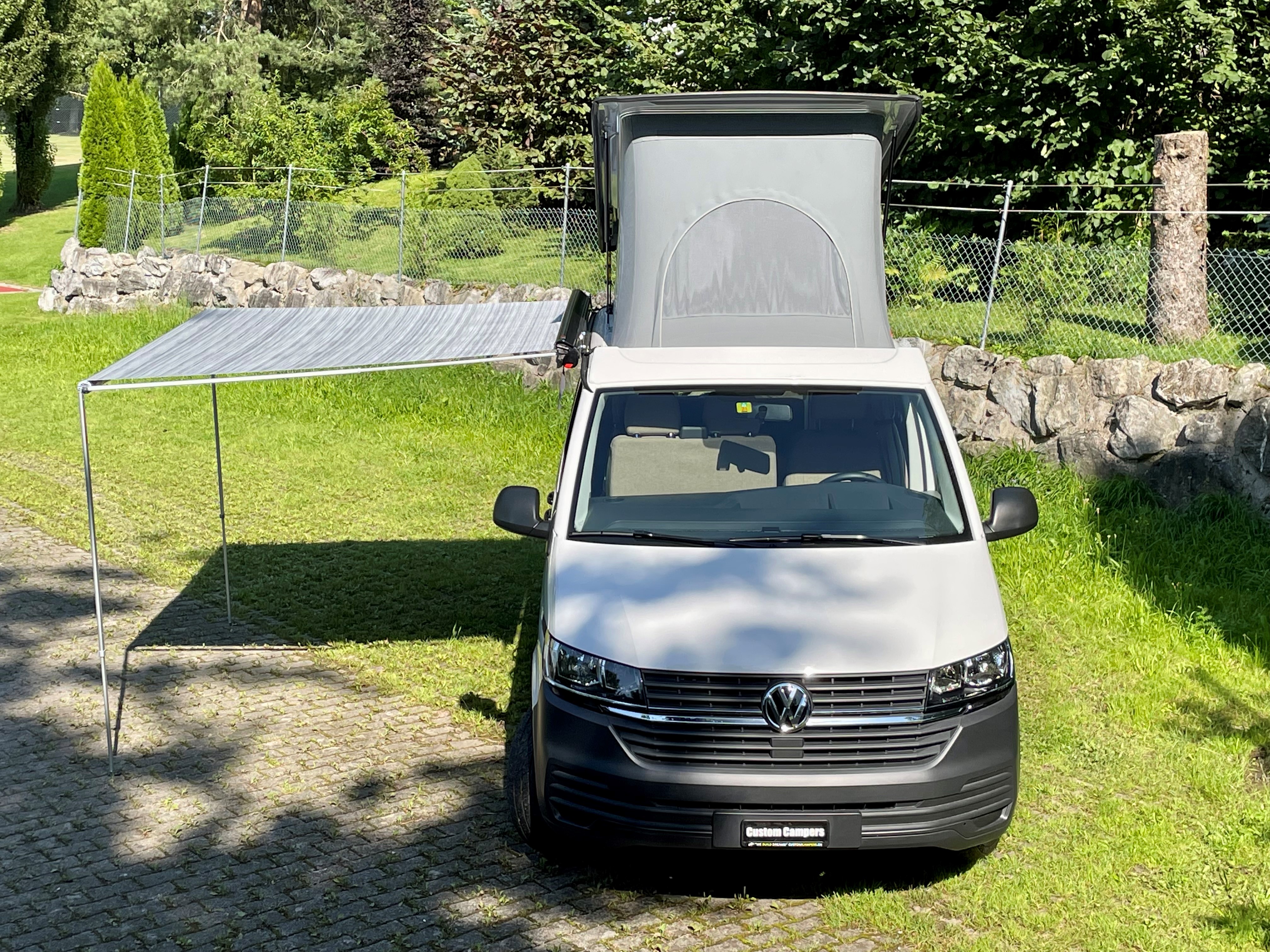 Ein besonderes Extra ist insgesamt die konsequent durchgezogene Holzoptik von der Unterseite des Aufstelldaches über den Kühlschrank bis hin zu der aussergewöhnlichen Leuchte im Küchenbereich.