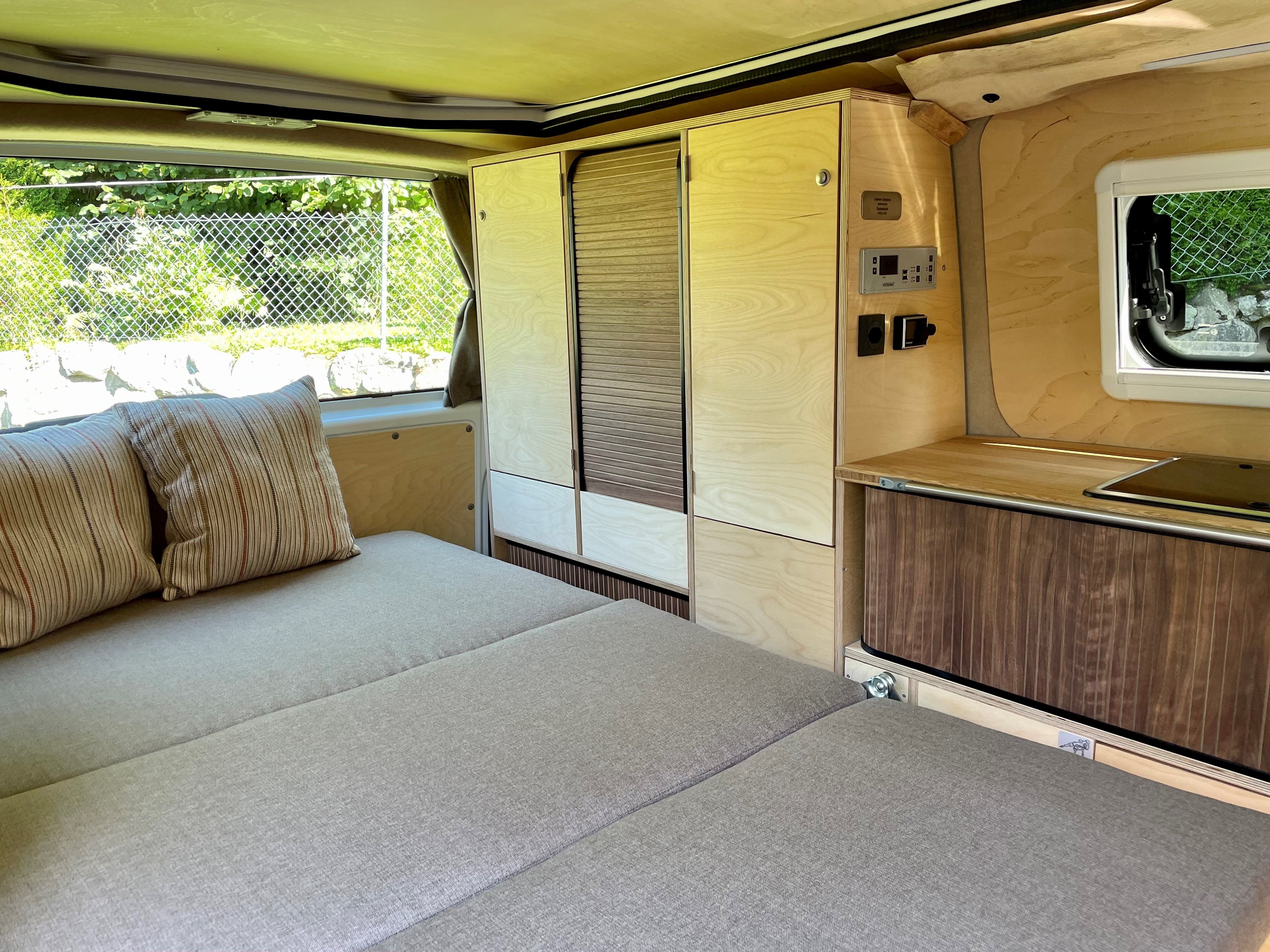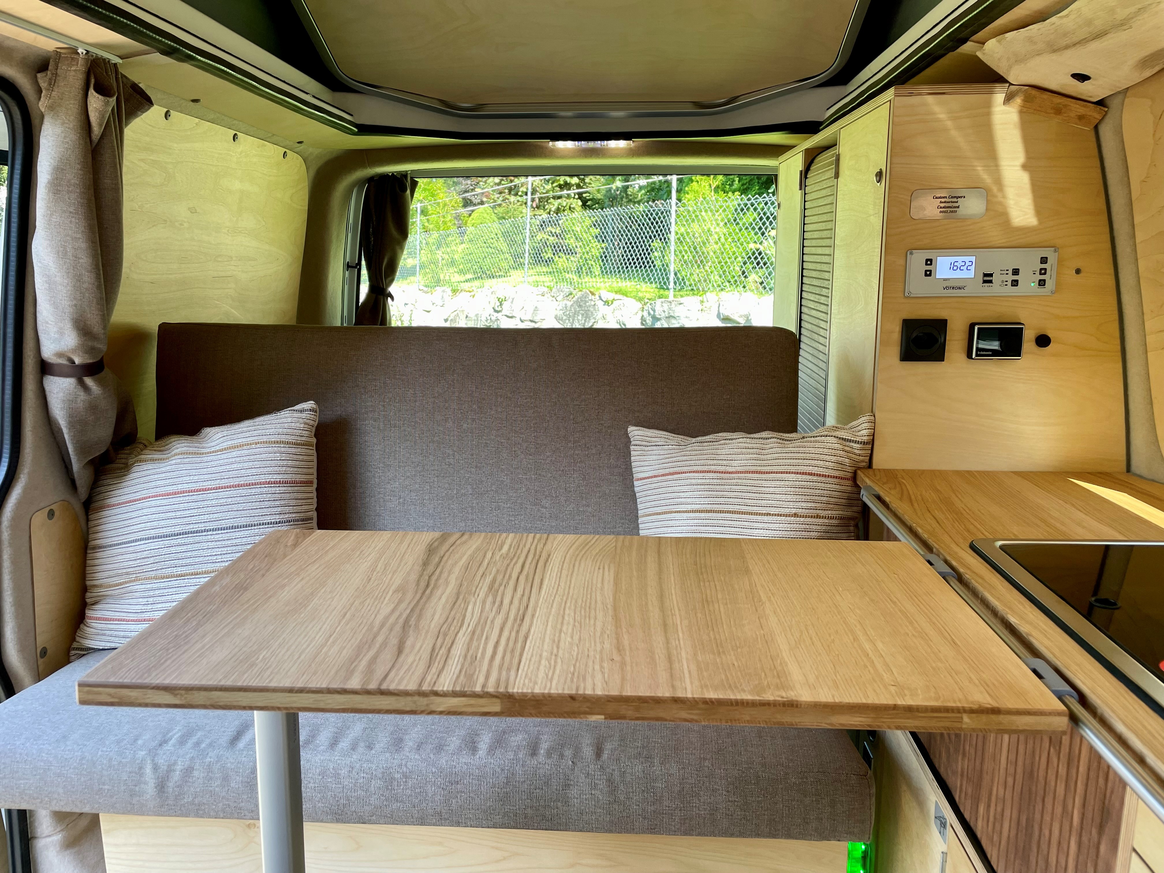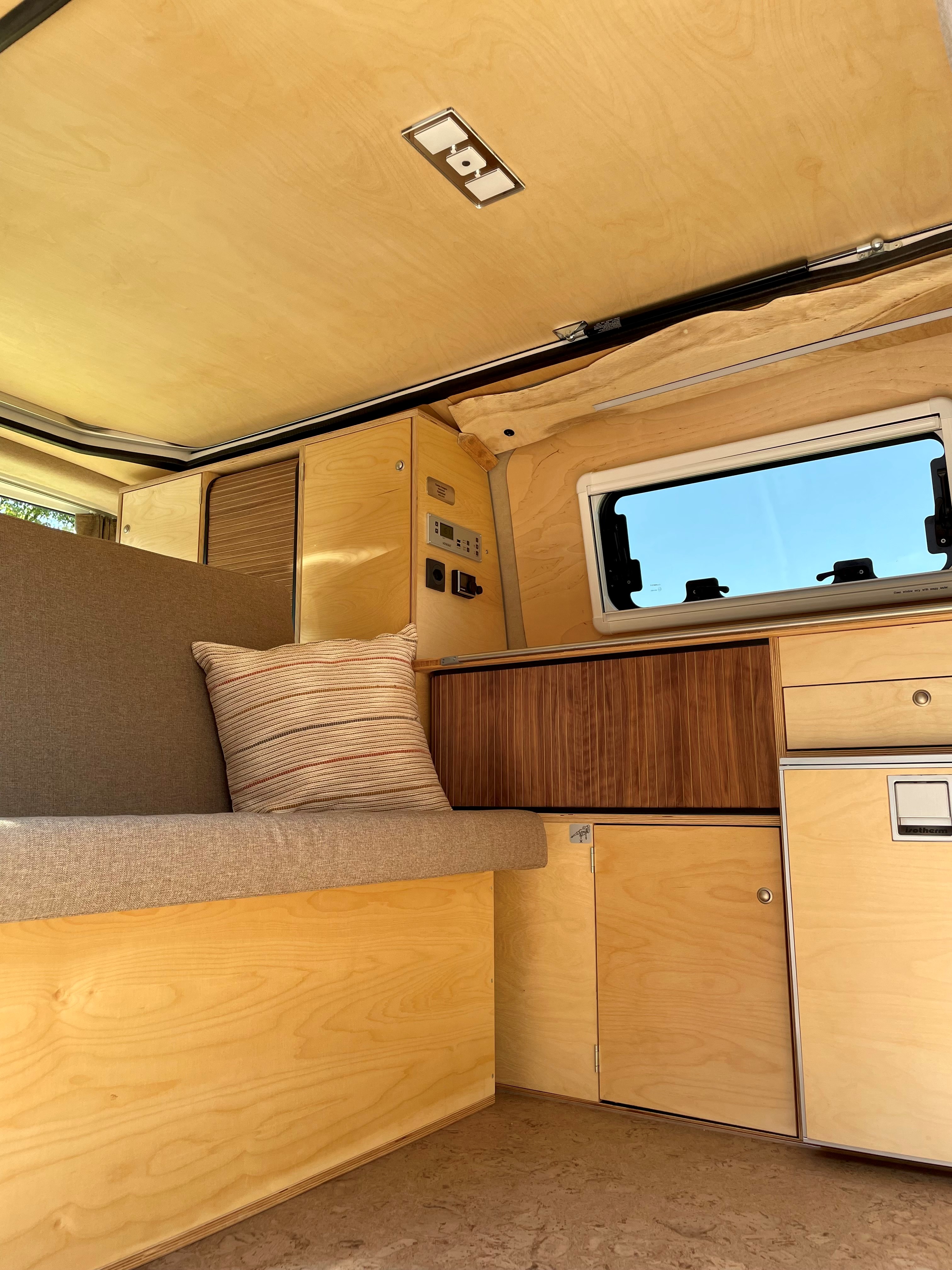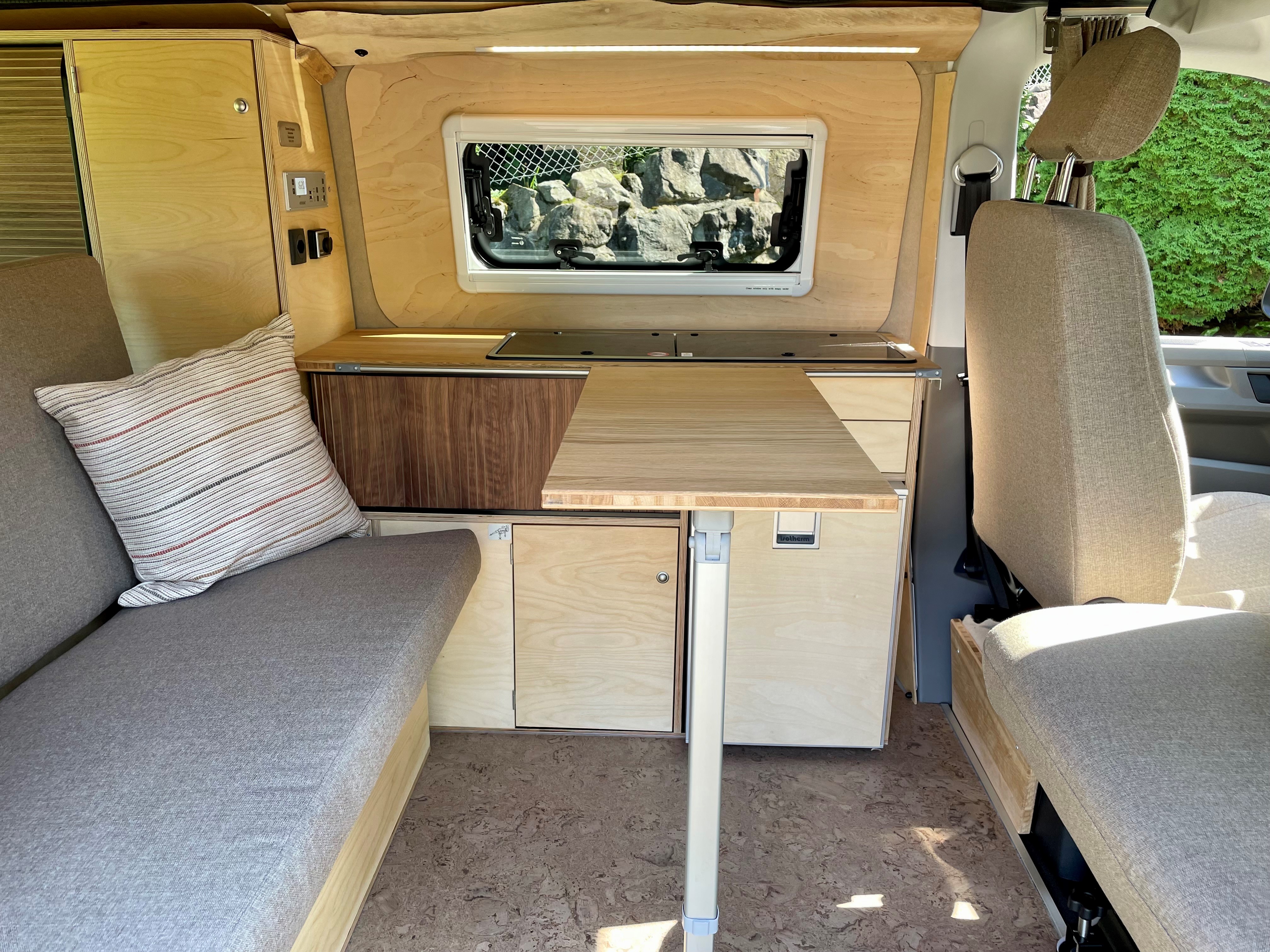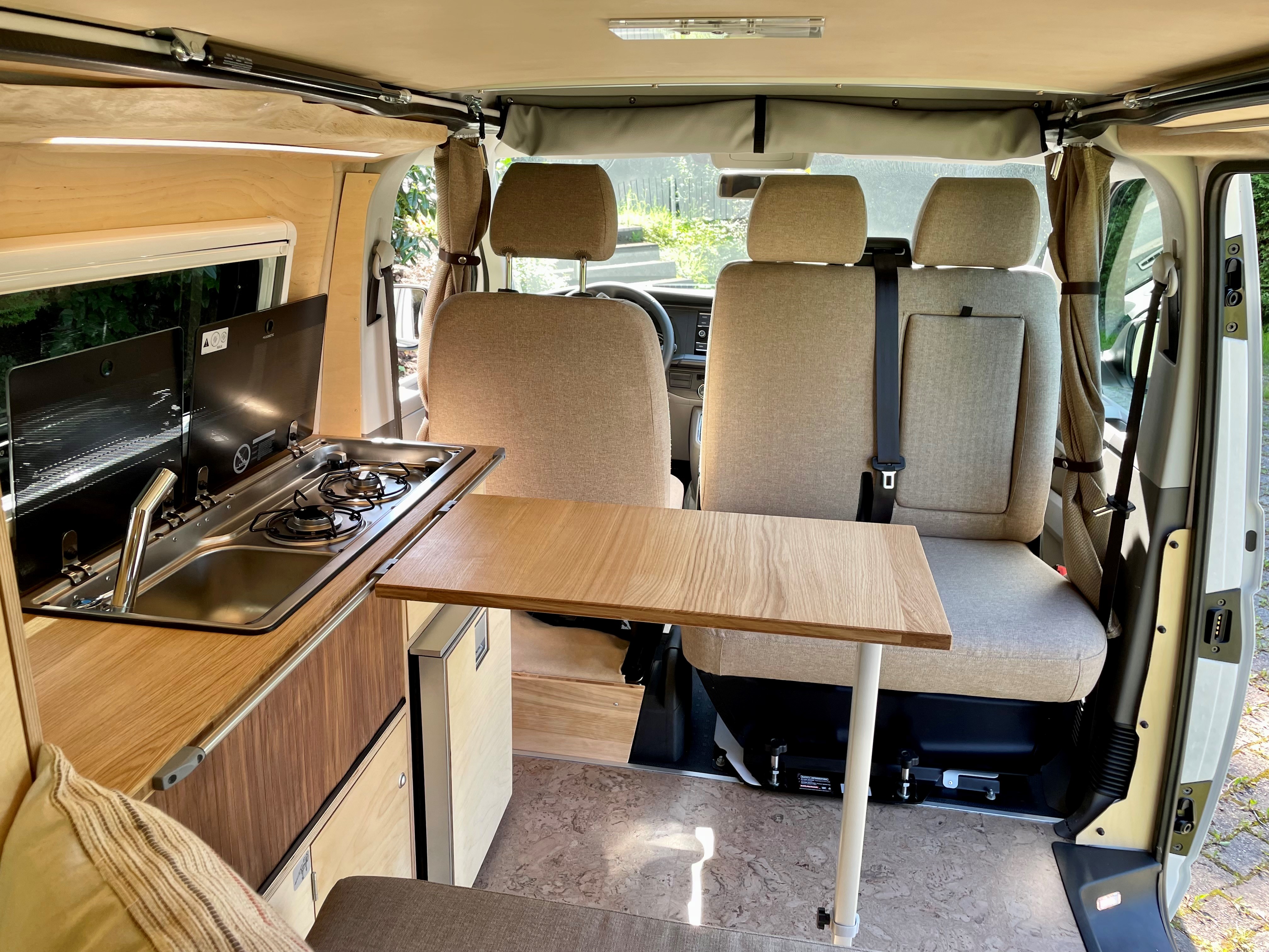 Der fertige Campervan wirkt durch das viele Holz und den Fussboden aus Kork so freundlich, hell, gemütlich und edel - wir können die Kunden nur zur Materialwahl beglückwünschen.